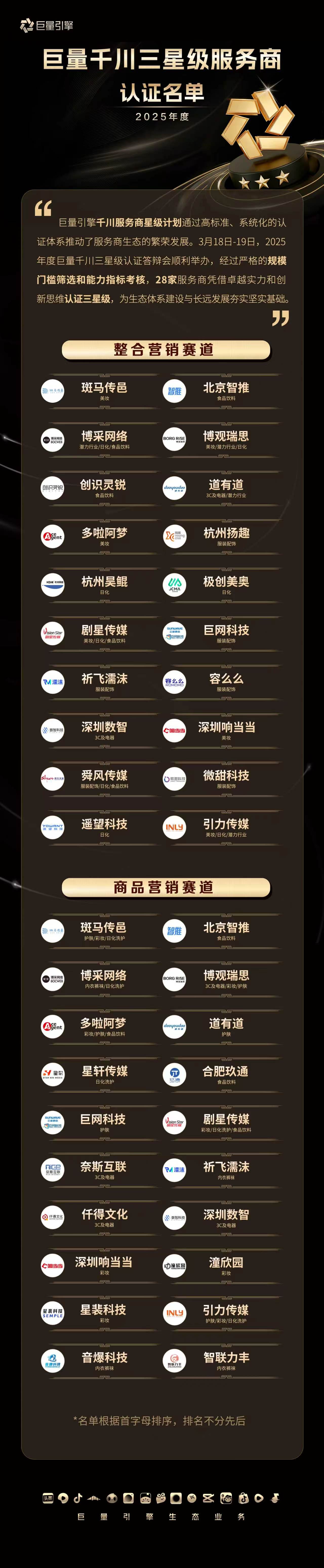 本次经过严格的规模门槛筛选、能力指标量化考核,结合千川业务实际运营表现、能力落地效果等多维度综合评审,最终28家服务商凭借硬核实力达标三星级认证标准,成功入选2025年度巨量千川三星级服务商认证名单!