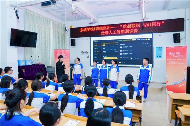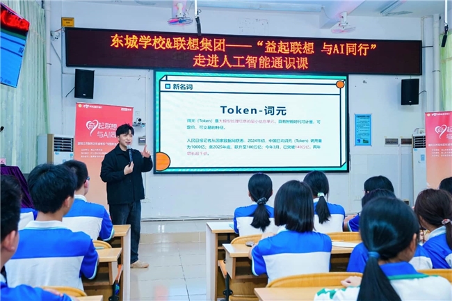 当日下午,东城学校气氛热烈,“与AI同行——走进人工智能”通识课吸引了师生的目光。来自七(1)班和八(1)班的百余名同学们,在联想员工的引导下,接触并体验了最新人工智能的魅力。课堂上,联想中国市场推广全国高校负责人邱安定化身为“科技导师”,用通俗易懂的语言和大量AIGC作品,带着大家开启了一段奇妙的AI科普之旅。同学们的合照被瞬间转换成可爱的卡通形象,科普学习最新的“词元”概念,还现场用AI工具即兴创作出了属于东城学校的科技之歌。
