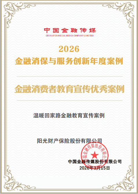 近日,中国金融传媒发布“2026金融消保与服务创新年度案例”名单,阳光财险“温暖回家路金融教育宣传案例”获评“金融消费者教育宣传优秀案例”。
