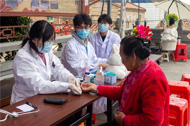 (实践队员为居民测量血糖)