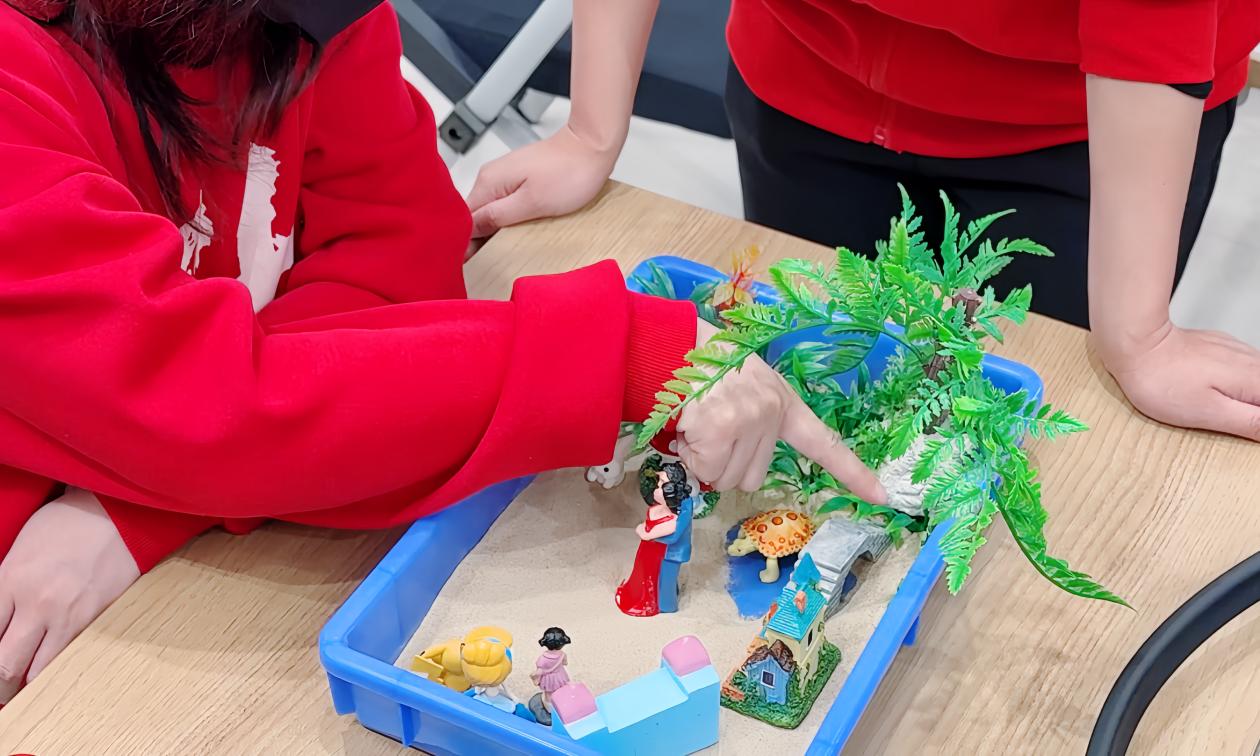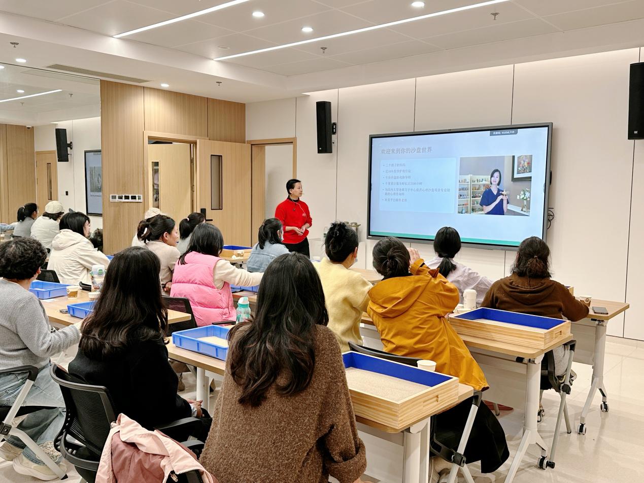 在欢喜陪伴老师欧阳姣的带领下,孕产家庭参与了“一沙一世界——沙盘里的秘密”团体沙盘游戏。通过沙具的挑选与摆放,参与者在安全的空间里释放情绪、照见自我,也让家人“看见”彼此内心世界的真实图景。