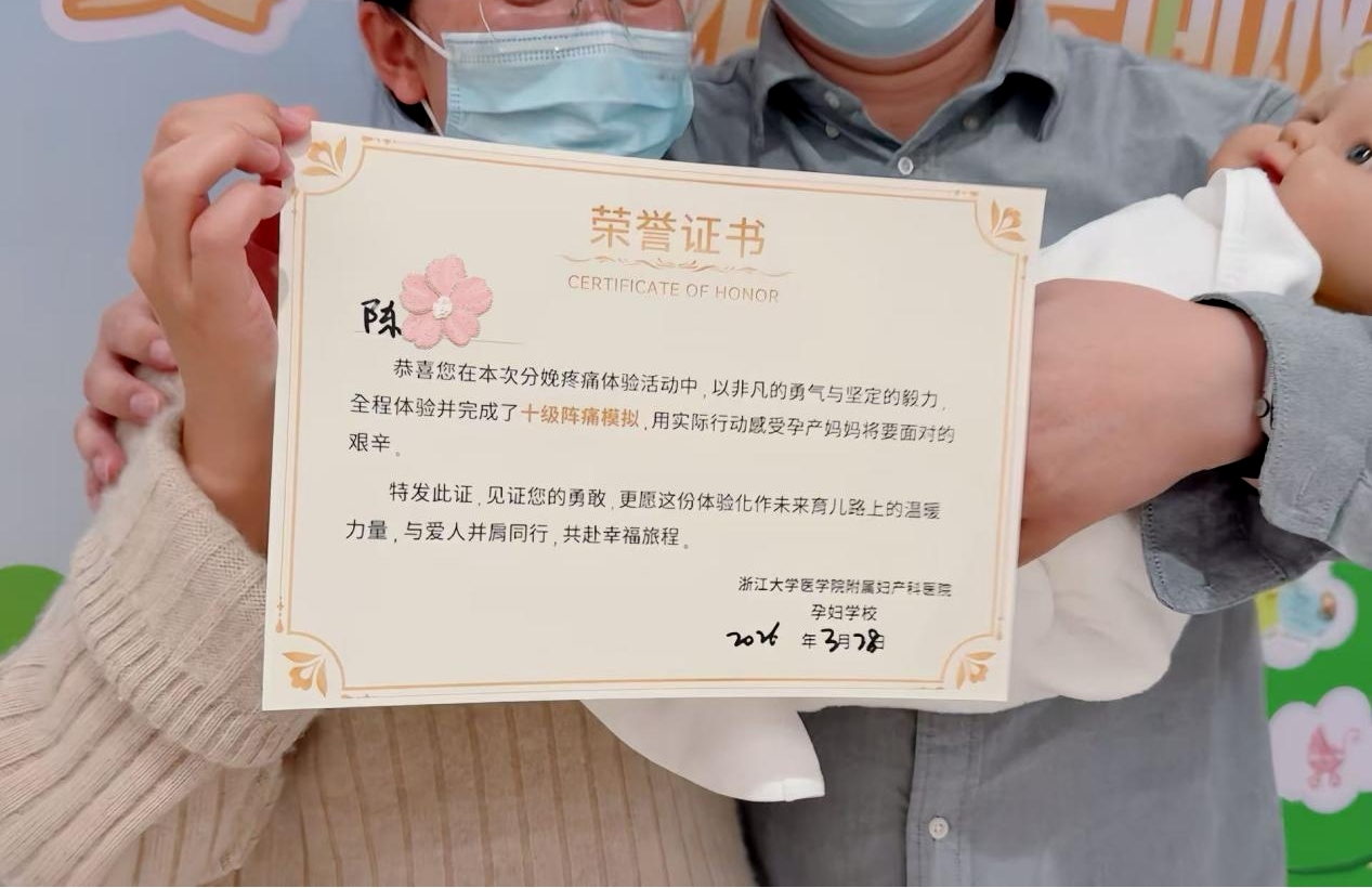 活动还设置了“疼·爱一瞬间——准爸爸分娩疼痛挑战”体验环节,邀请准爸爸亲身感受分娩不易。完成挑战的准爸爸获得了由院方颁发的荣誉证书,这份体验成为他们理解妻子、参与家庭养育的情感基石。