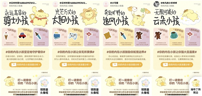 本次上线的人格测试来源于著名心理学家荣格的分析心理学与内在小孩理论,通过礼物挑选与赠送的互动方式,带领用户开启治愈之旅。用户可从“食物、玩具、宝物”三个类别中选择三份礼物,并分别送给三个年龄阶段的自己,包含5岁的本我、10岁的自我以及现在的超我。透过礼物,用户将看见内在的自己是“永远高昂的骑士小孩”“光芒万丈的太阳小孩”,或是“奔赴旷野的追风小孩”“无限可能的云朵小孩”等。