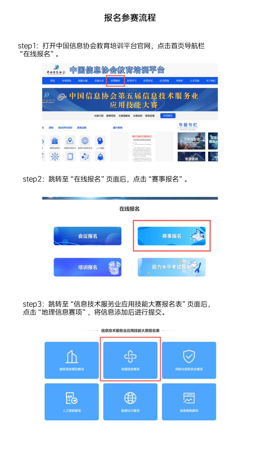 参赛选手以团队或个人的形式报名参赛。选手可以通过搜索“中国信息协会教育培训平台”官网直接报名参加大赛,或关注“地理信息专业能力”官方公众号,获取更多赛事信息。