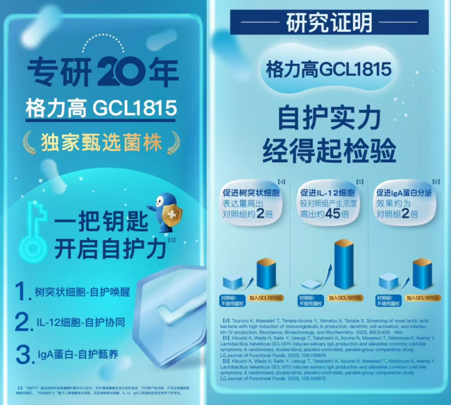 此次升级的核心,是配方的全面革新。每盒必思可双菌饼干添加约168亿CFU菌,采用独家双菌配方——凝结魏茨曼氏菌与格力高GCL1815瑞士乳杆菌(以下简称格力高GCL1815)。凝结魏茨曼氏菌以其能保持活性抵达肠道的特性,守护「肠」健康;而格力高GCL1815能够激活树突状细胞,启动“自护唤醒”;促进IL-12蛋白产生,实现“自护协同”;提升IgA蛋白分泌,达成“自护甄养”,三重机制,共同开启三大自护力,助力孩子“自护力,不缺勤”。