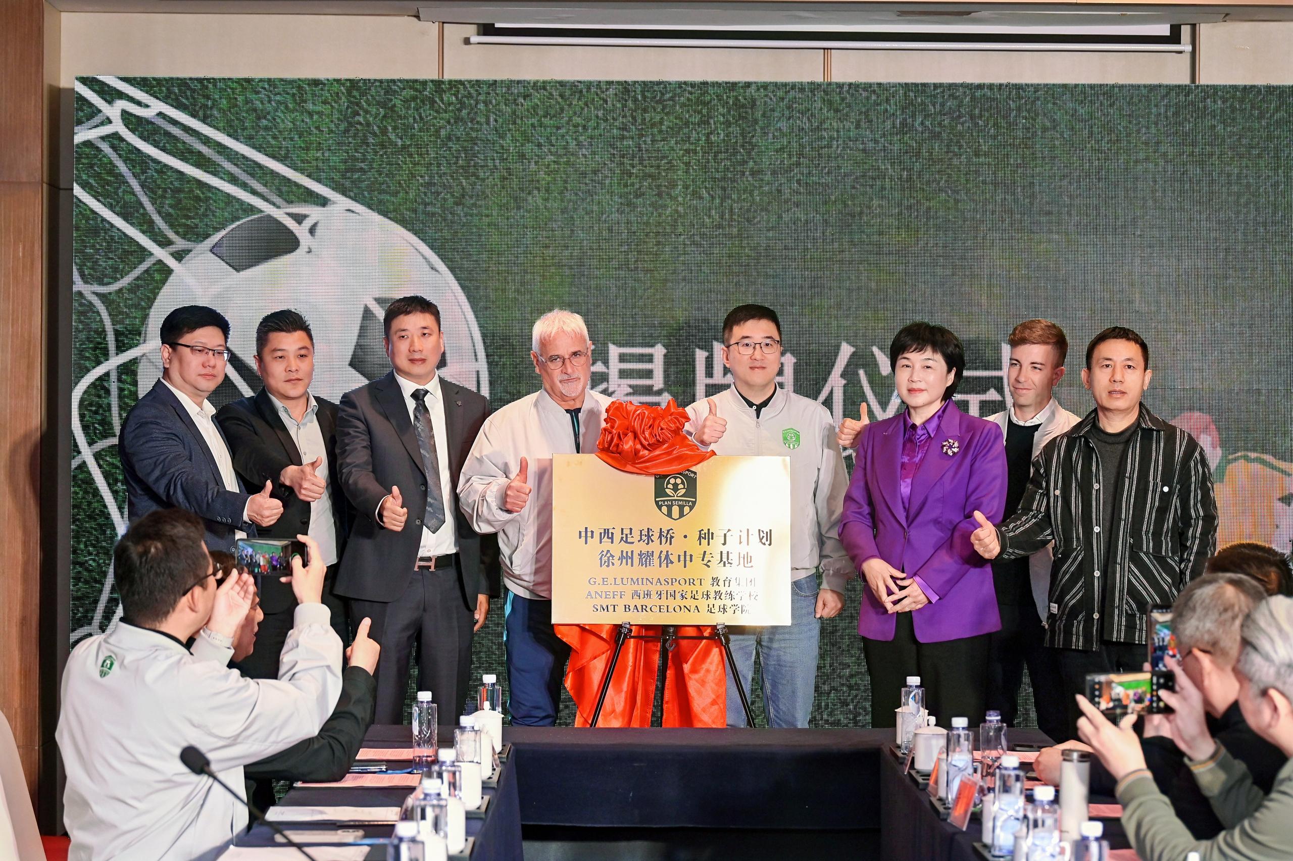 金匾启新,华章绽放。签约仪式后,与会嘉宾为“中西足球桥・种子计划”徐州市耀体中专(筹)基地揭中、外文牌。