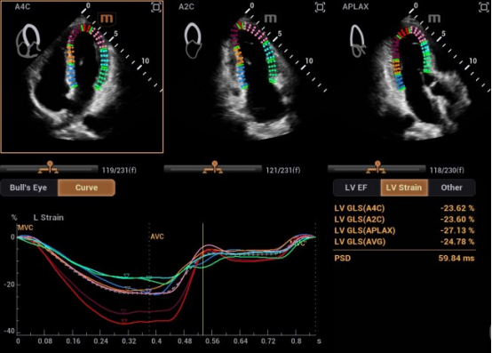 在研发中,迈瑞研发团队另辟蹊径,推出了自动左心室应变评估 Auto Strain LV 。该功能不再依赖心电信号作为“时间坐标”,而是让AI直接识别心脏机械运动的关键节点——当二尖瓣关闭、主动脉瓣开放,这些瓣膜运动的瞬间,就是心脏收缩与舒张的自然锚点。