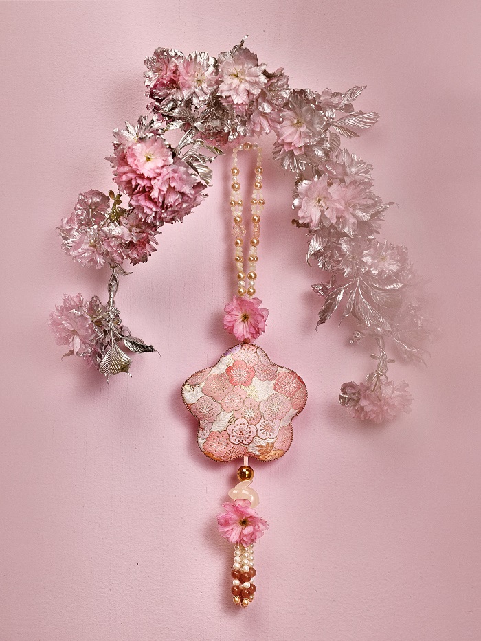樱花清酒提花香囊 锦面粉白相间,天然白色珍珠贝手工逐颗串制,透亮轻盈,自然光下色泽柔和内敛。缀有一只可爱小兔,随身携带,所经之处,皆是樱花香气。