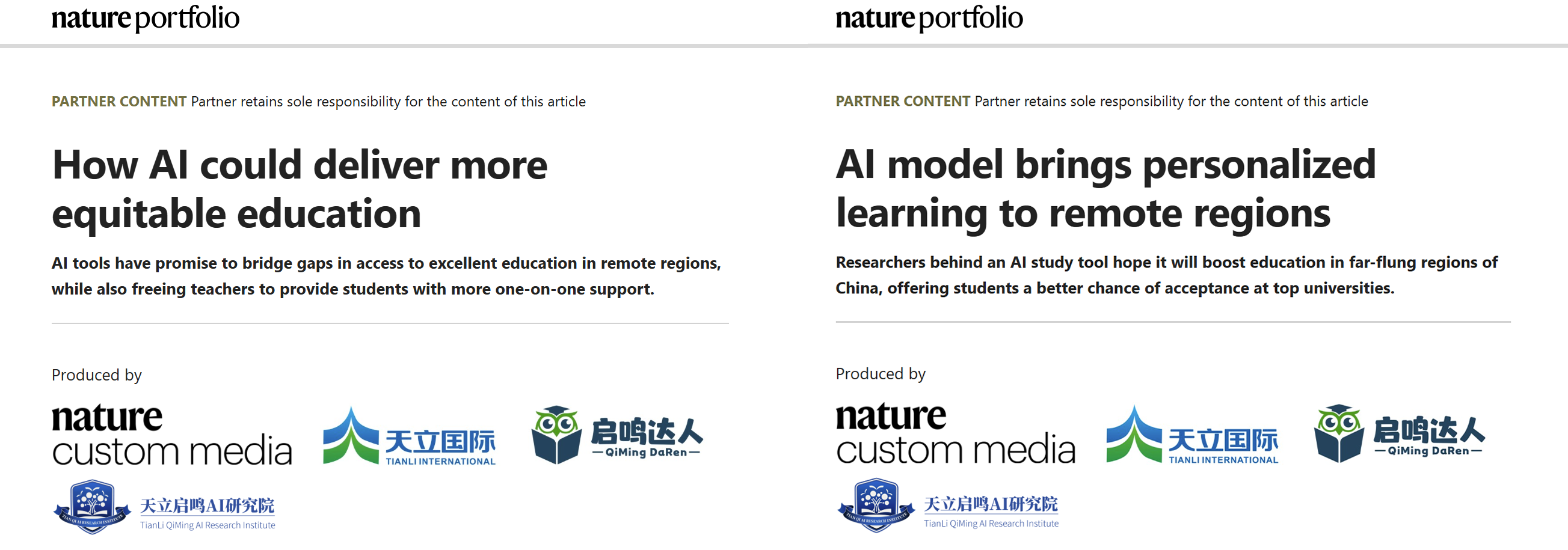 近日,国际顶级学术出版机构《自然》(Nature)Index China 特刊发布了《AI 模型为偏远地区带来个性化学习》《AI 如何实现更公平的教育》两篇文章,对天立启鸣AI研究院面向教育AI领域的天立学科大脑等创新成果进行了重点报道。