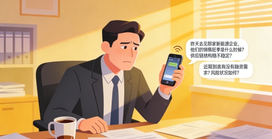 清晨,张经理的咖啡还没喝完,手机就响了:“昨天去见那家新能源企业,他们的销售旺季是什么时候?供应链结构稳不稳定?近期到底有没有融资需求?风险状况如何?”一连串问题让张经理头皮发麻,无法应对。