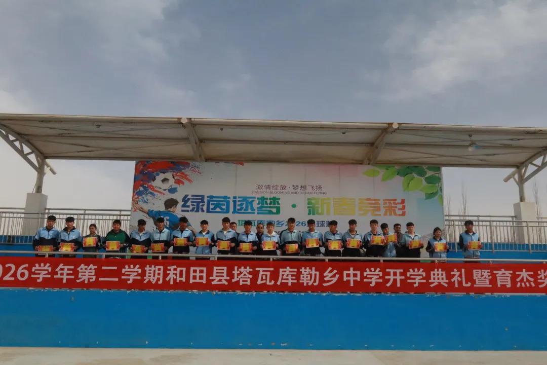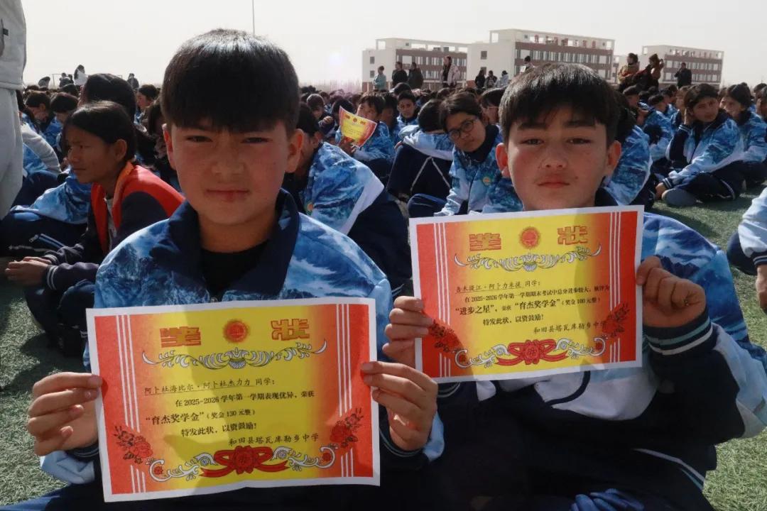 2026年3月19日,和田县塔瓦库勒乡中学大操场主席台彩旗飘扬,全体师生身着统一校服,隆重举行2025-2026学年第一学期期末考试表彰大会暨育杰奖学金发放仪式。这一活动既是对优秀学生的隆重表彰,也是育杰奖学金深耕乡村教育、助力南疆学子成长的生动实践。