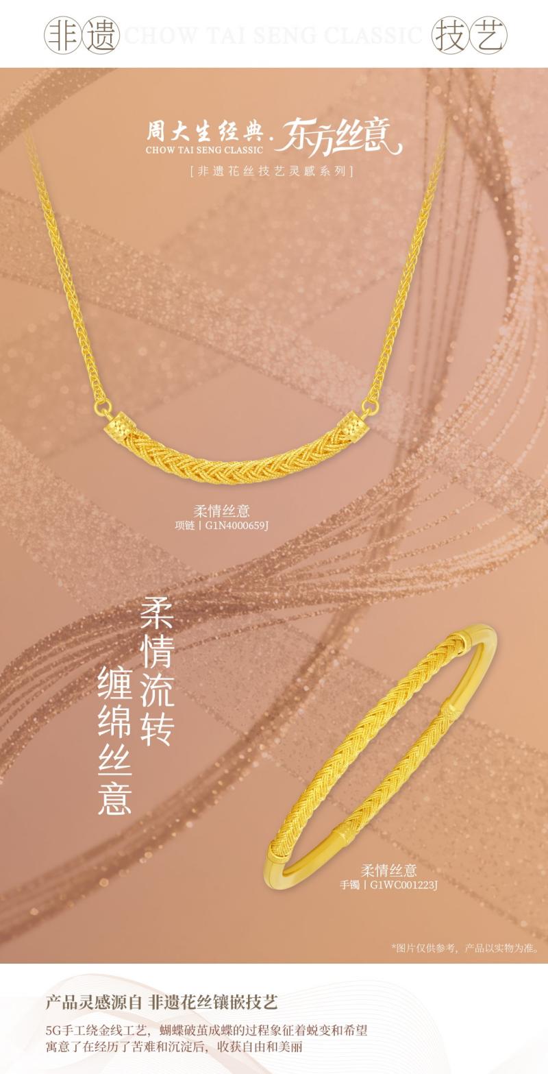 柔情流转,缠绵丝意。周大生经典东方丝意系列新品“柔情丝意”,以5G手工绕金线工艺重释东方丝韵。匠人执金为丝,手工拉制细如毫发的金线,令黄金表面流转绸缎般的光影;再以手工编织批管元素缠绕交织,层叠生姿。随步履轻移,“柔情丝意”更跃动高贵暖金光泽;几何线条简约大气,尽显从容贵气,让每一位佩戴“柔情丝意”的女性于颈腕舒展间尽释魅力。
