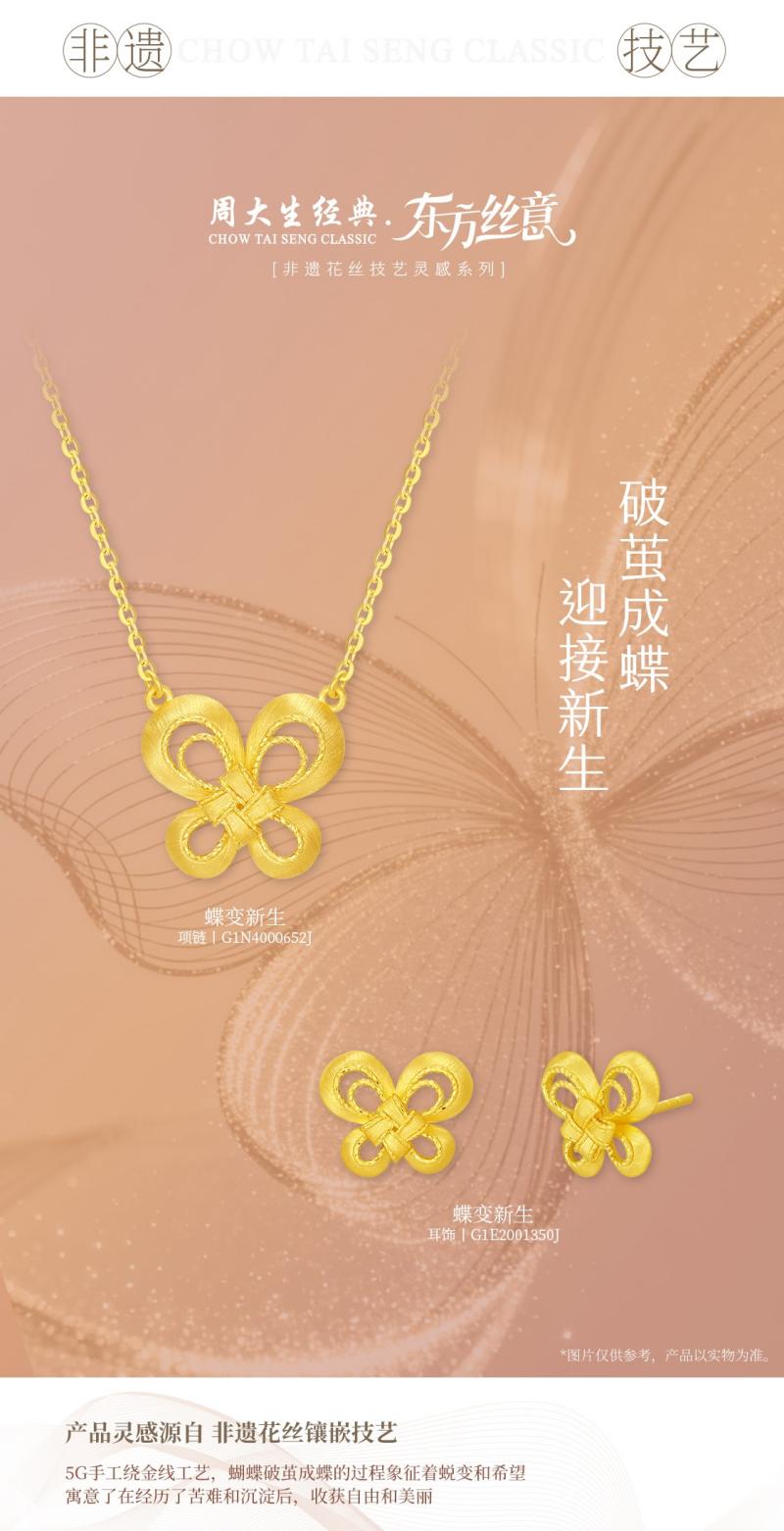 周大生经典东方丝意系列新品“蝶变新生”,将破茧成蝶的蜕变之力凝于金丝之上。蝴蝶振翅,象征着生命的重塑与希望的升腾,于困顿中启运新生,于沉淀后终获自由与美丽。“蝶变新生”以5G手工绕金线工艺,拉出细若蝶丝的金线,表面更流淌着丝绸光泽;再以手工编织批管元素缠绕交织,舒展似翼之将振。“蝶变新生”的经典几何造型取蝶翼之廓,于颈腕间翩然若栖,让每一位佩戴者于举手投足间,绽放历经淬炼后的柔韧风骨。