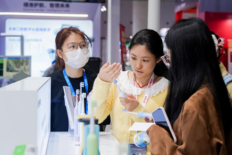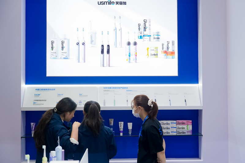 与此同时,usmile笑容加产品体验区同步对外开放,新品C30冲牙器首次亮相展会,Y30智能电动牙刷、Q30儿童骨传导电动牙刷、以及口腔快消美白牙膏等全龄段核心产品悉数亮相,现场安排了专业工作人员进行讲解与演示,让观众可近距离体验搭载自研专利电机、微气泡水流等核心技术的产品,直观感受科技对口腔护理领域的变革性影响。