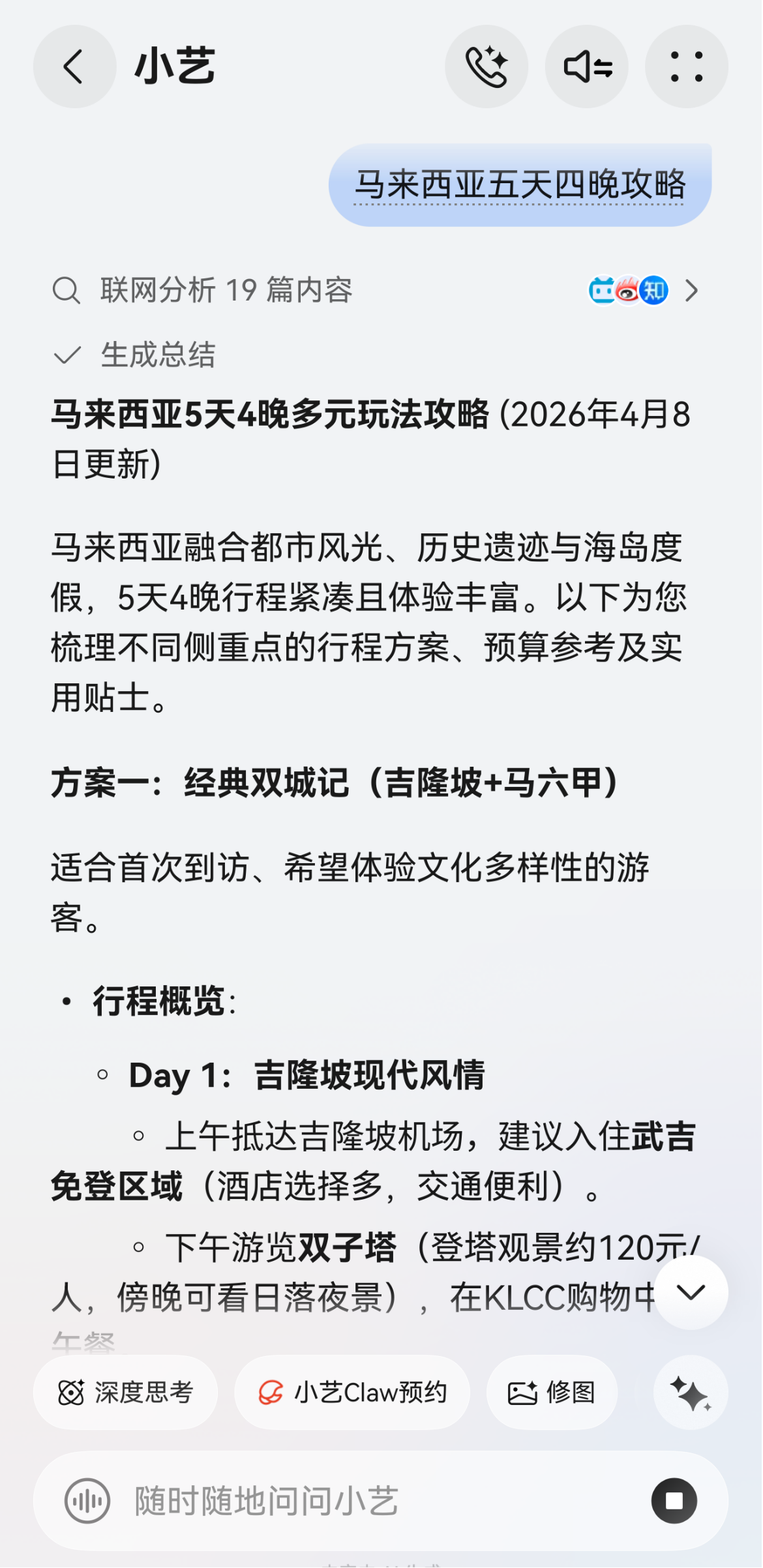 针对行程规划中的景点选择、美食推荐及路线优化需求,只需语音或长按电源键唤醒小艺并提问“马来西亚四日游攻略”或“泰国美食路线规划”的语音指令,即可获得包含景点、交通及特色餐饮的出游方案。