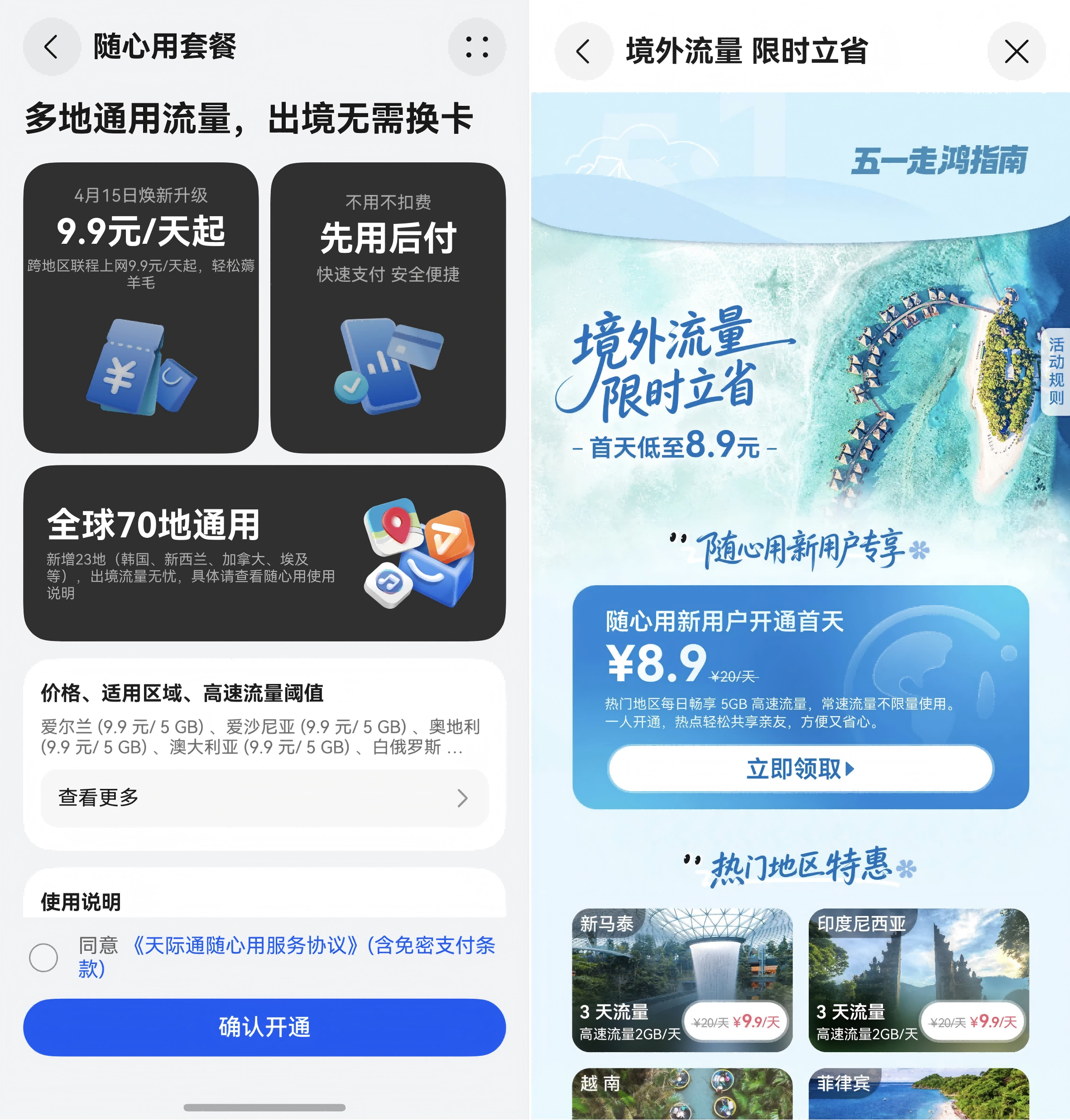 出境用户常面临国际漫游资费高、当地流量卡换卡流程繁琐、随身WiFi信号不稳定等情况。天际通「多地流量随心用」服务覆盖欧美、日韩、东南亚等70个热门地区,为用户提供丝滑的出境网络体验。用户只需在起飞前于App内开通,抵达后无需换卡即自动联网。支持先用后付,按天付费,五一期间随心用新用户首天仅8.9元,还能一键共享热点,一人开通全家连网。