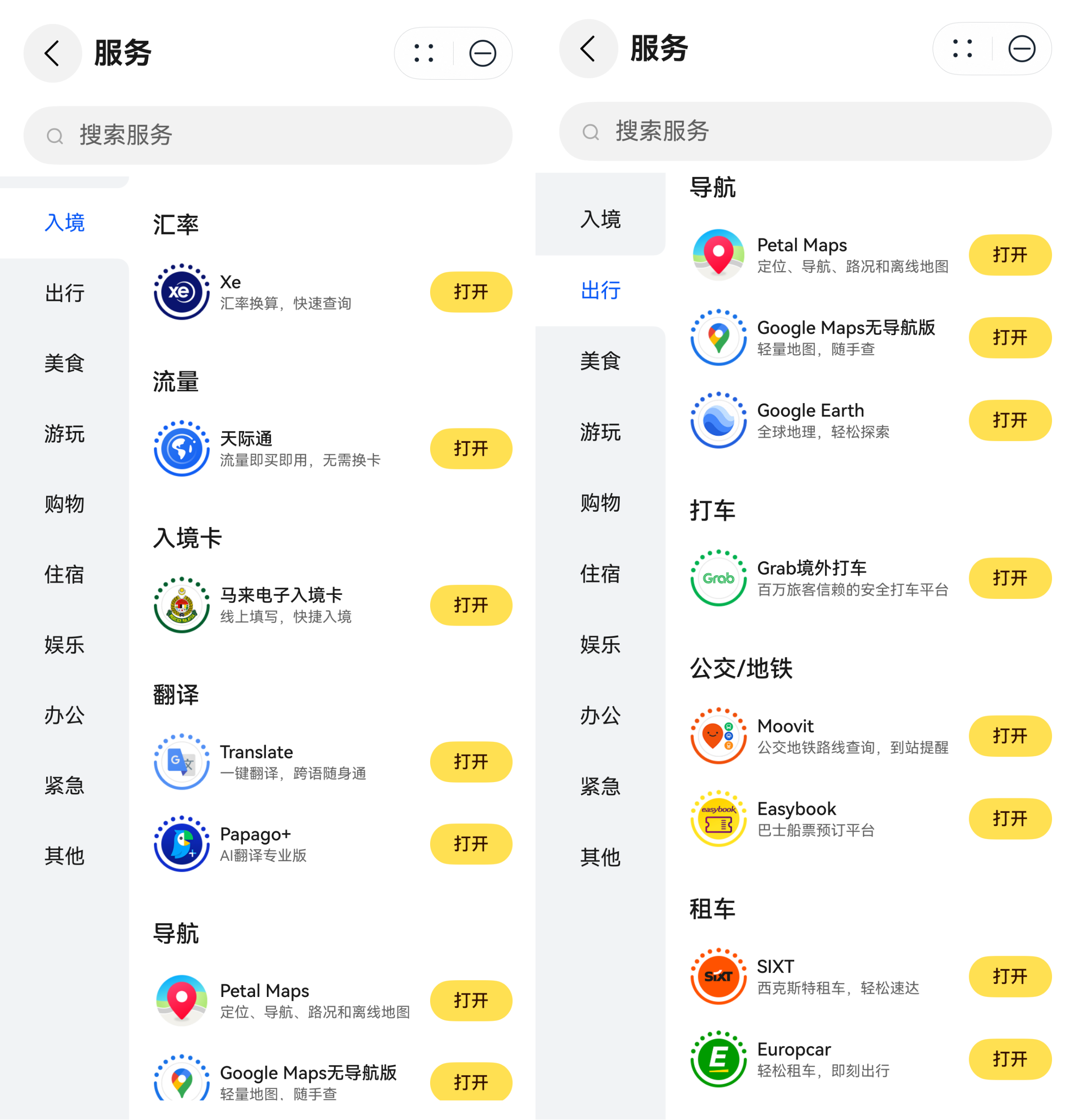 华为负一屏可提供所在地专属服务,桌面右滑进入负一屏搜索出境服务,即可享涵盖本地导航、境外打车、商圈优惠、实时汇率、美食外卖等刚需功能,使用华为账号一键登录免注册即可使用,无需下载及反复切换App,轻松享受本地化应用服务。