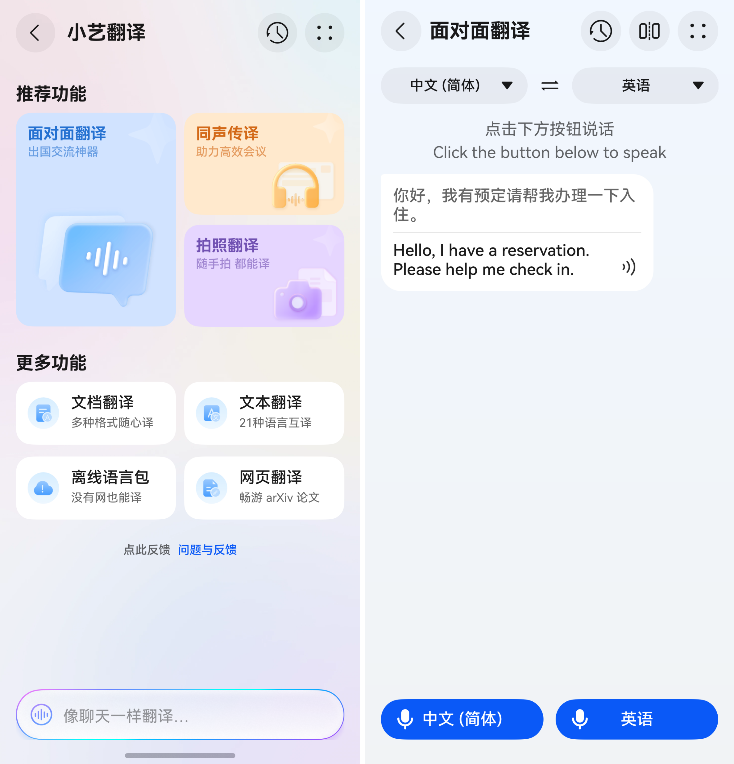 小艺翻译助手支持英语、日语、韩语、泰语等21种语言互译,可进行面对面翻译、拍照翻译等。面对面翻译模式下,屏幕显示双语对话区,用户说中文实时转为当地语言,对方回复的外语自动译成中文。拍照翻译功能支持拍摄外语路牌、商品标签、菜单等图片进行对照翻译,轻松打破语言沟通障碍。