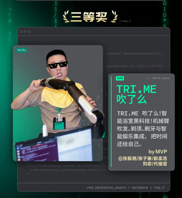 而荣获硬件赛道三等奖的TRI.ME“吹了么”团队,则由曾获国际机器人大赛冠军的00后创始人与大厂消费电子专家、技术UP主共同组成。他们将目光锁定在“洗漱台前10分钟”这一注意力真空区,开发了一套模块化具身理容机械臂。该项目深度融入鸿蒙生态,将鸿蒙系统作为产品交互的核心,实现了洗浴场景下的分层智能感知、多模态交互以及基于VOA的持续OTA进化能力。
