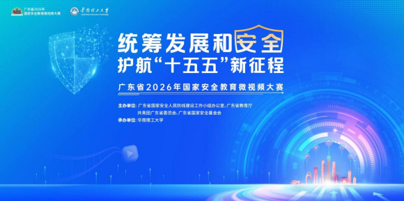 4月15日是全民国家安全教育日。为深入贯彻落实总体国家安全观,扎实推进国家安全教育常态化、长效化,切实筑牢国家安全人民防线,由广东省国家安全人民防线建设工作小组办公室、广东省教育厅、共青团广东省委员会、广东省国家安全基金会联合主办,华南理工大学承办的广东省2026年国家安全教育微视频大赛圆满完成作品征集、资格审核、专家评审等各项工作,获奖结果正式揭晓。大赛颁奖典礼将于2026年4月23日16:00在华南理工大学五山校区隆重举行,现场将颁发一等奖、二等奖、三等奖、优胜奖、指导老师奖、最佳单位组织奖、优秀组织奖及最佳人气奖,集中展播优秀作品,全面展现广东青年以青春之力守护国家安全的时代风采。