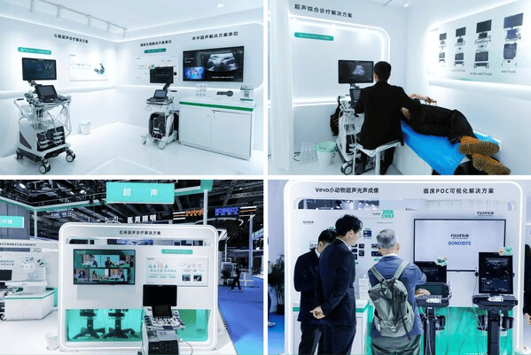 在超声诊疗解决方案区域,集中展示了从超声综合诊疗到心脏、术中、辅助生殖、肛肠等多个专科方向的临床应用方案。围绕实际临床路径设计展示,让参观者能够了解不同超声系统在脏器成像、介入引导、生殖医学支持、盆底及肛肠诊疗等领域的应用特点,体现富士胶片在专科化、精细化医疗领域的持续实践。