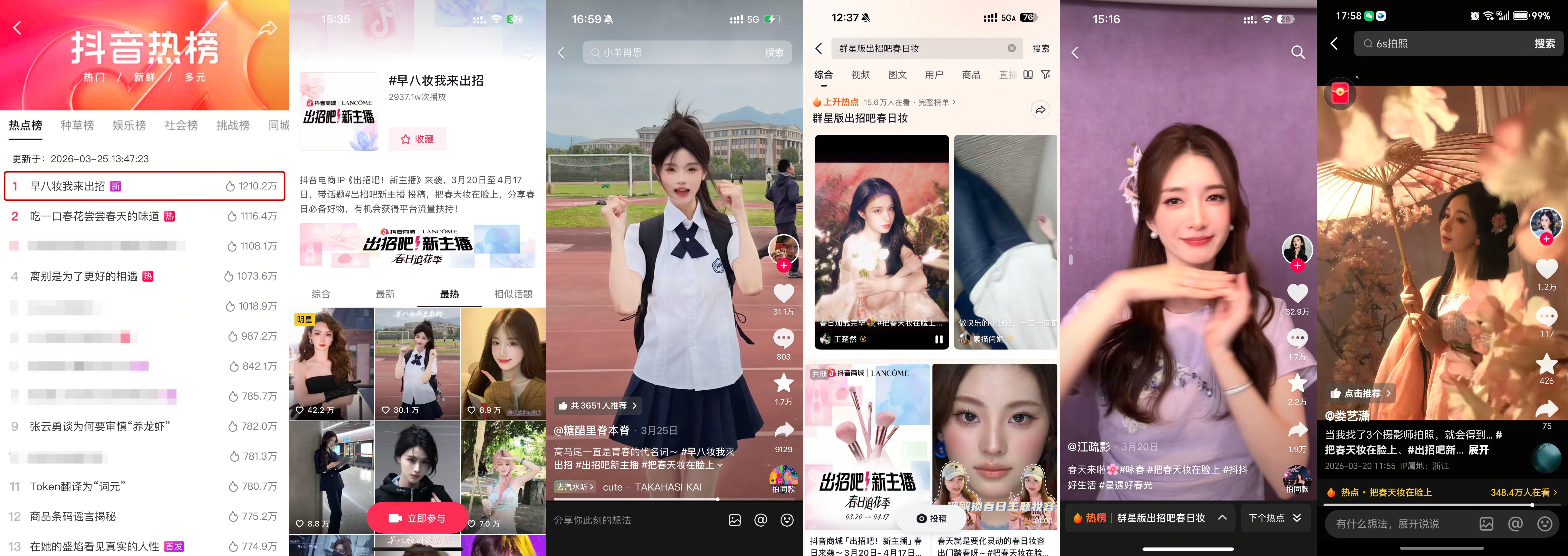 @王楚然、@娄艺潇、@江疏影等明星集体助阵,强势为春日妆容打call,衍生热点 #群星版出招吧春日妆,全方位为活动预热造势;与此同时,聚焦生活日常场景打造内容热点#早八妆我来出招,直击学生党、打工人“快速精致出门”的刚需,同样拿下双榜TOP1,话题曝光超3700万,为活动再添一把火!
