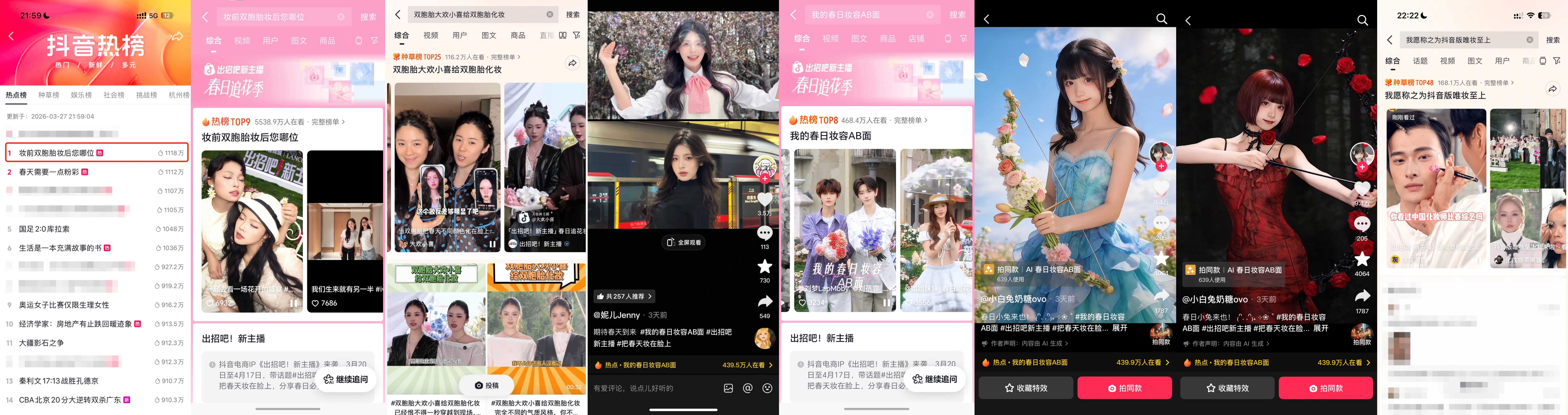 内容直播全程热度拉满,开播前特色内容热点#妆前双胞胎妆后您哪位 便强势登顶全国榜前5,为直播间蓄水引流;双胞胎美妆主播@大欢小喜 凭借“蔷薇粉彩”、“香水百合”妆强势突围,喜摘冠亚军桂冠,同步发酵热点登种草榜TOP25;直播衍生内容热点#我的春日妆容AB面 最高登热榜TOP8、种草榜TOP5,官方同步推出红蓝CP特效玩法;直播大事件内容二创持续发酵,#抖音版唯妆至上等热点话题相继登榜,让春日美妆竞技的热度持续不散。