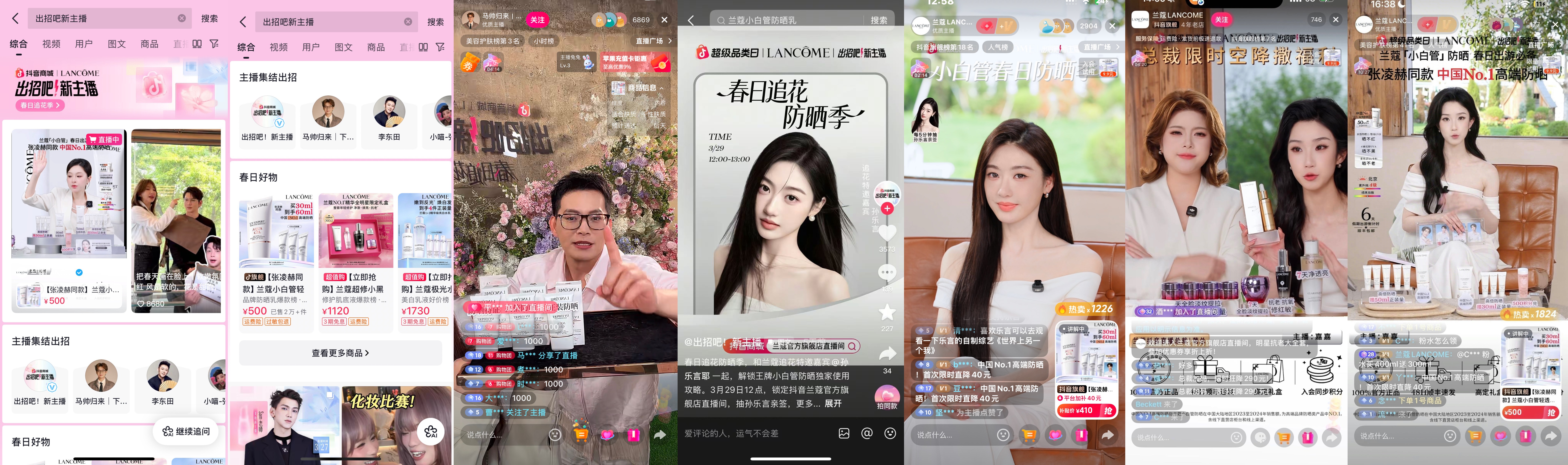 抖音电商为兰蔻定制了全链路曝光矩阵,多维度助力品牌声量破圈、实现流量与销量双丰收,全程节奏清晰、层层递进。预热阶段,结合星图达人视频植入,为兰蔻打造户外防晒热点登种草榜TOP36,提前为品牌蓄水、积累人气;直播大事件期间,春日主理人与追花团反复口播兰蔻小白管产品「高倍防晒力,轻透好肤感」的核心功效,结合现场化妆选手的产品使用,情景化演绎,让用户全方位了解产品优势;主理人@马帅归来 顺势承接活动热度,为兰蔻开设专场带货直播,实现流量快速转化,当场GMV突破400万+