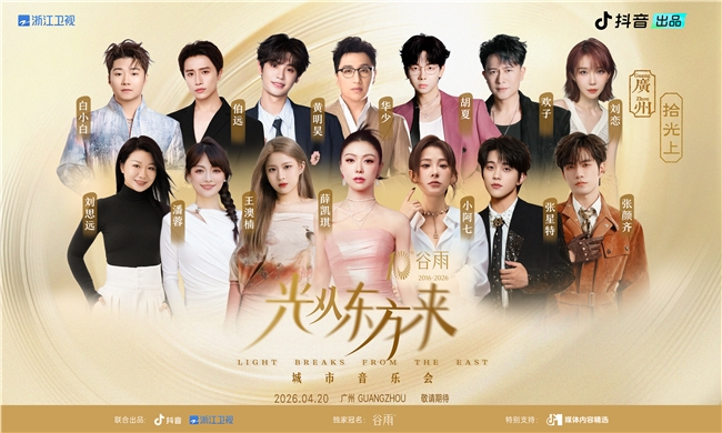 「光从东方来」城市音乐会,历经北京 “破万象”、西安 “启新生” 后,正式迎来追光之旅的终点站——广州“拾光上”。近日,这场由谷雨独家冠名,抖音联合新华社客户端、浙江卫视共同打造的音乐盛宴,正式官宣定档,将于 2026年4月20日盛大启幕。
