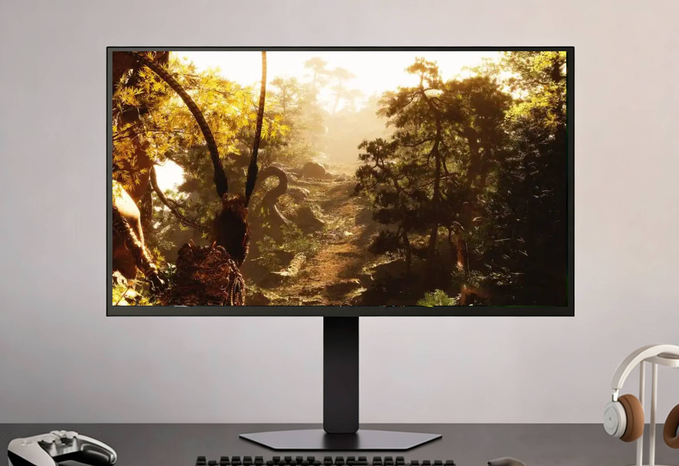 《黑神话:悟空》的魅力,更在于将东方水墨美学与现代 3A 画质完美融合,从黑风山的青灰水墨色调,到花果山的青绿山水意境,再到天庭场景的金红庄重配色,传统国风色彩的运用极具考究。LG UltraGear 27GX790B 覆盖 99.5% DCI-P3 广色域,搭配原生 10bit 色深,可还原 10.7 亿种色彩,精准呈现游戏中每一种国风色彩的特质:青灰石壁的古朴、翠绿竹林的清新、赤焰火云的浓烈,色彩过渡自然细腻,层次感拉满,完美复刻宋画 “咫尺之内再造乾坤” 的山水意境。同时,显示器 Delta E≤2 的专业级色准,让游戏中角色的毛发质感、铠甲纹理、法宝光泽都得到精准还原,孙悟空的锁子甲金属反光、妖怪的皮毛纹理,都栩栩如生,让东方神话的视觉表达更具真实感。