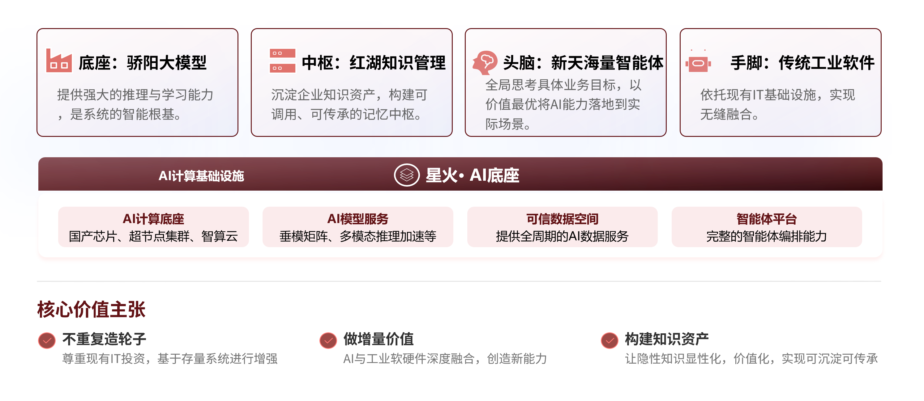 ●纵向上,提供全栈能力赋能:以国产化AI算力底座为基石,依托具备精准行业认知的“骄阳·工业大模型”,通过“红湖·可信数据服务平台”将海量工业数据与知识转化为可调用的资产,并由“新天·智能体平台”,将AI能力灵活编排并落地到运营办公、生产管理、过程控制等业务场景。