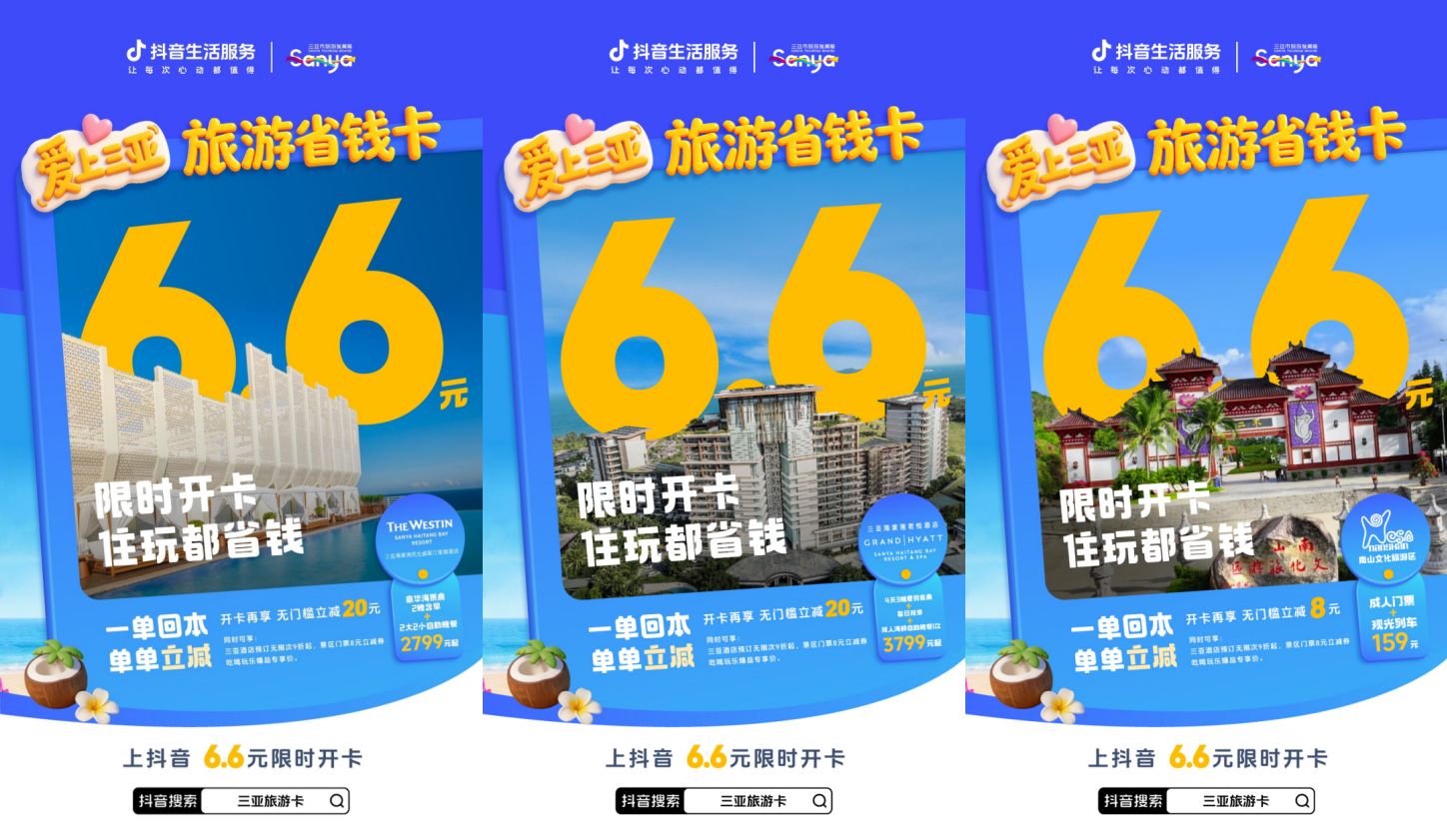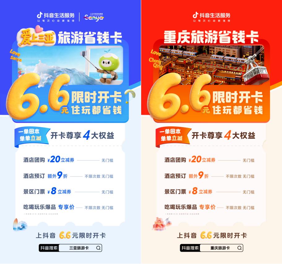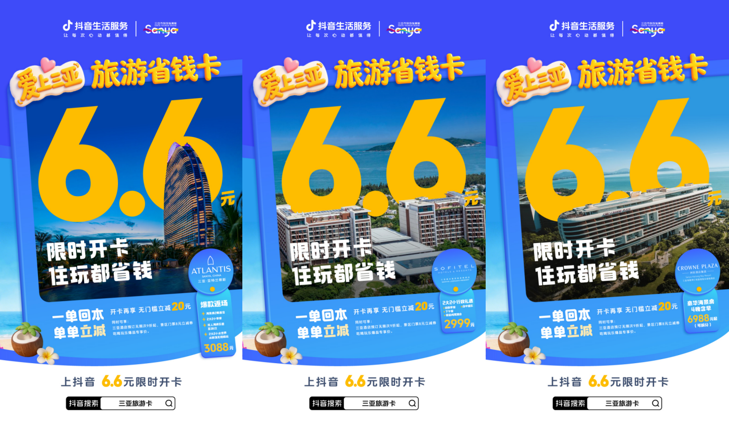 官宣!五一出游季在即,抖音生活服务正式启动旅游省钱卡专项推广活动。三亚站携手三亚市旅游和文化广电体育局,联合推出「爱上三亚」旅游省钱卡。本次活动旨在通过千万级资源投入,全方位优化游客在三亚、重庆的住宿与游玩体验,开卡即享酒店立减、酒店折上折、景区立减等实实在在的省钱权益,让每一位奔赴山海与山城的游客,都能享受到实打实的“真金白银”优惠。