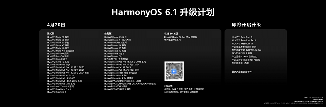 当然,除了以上这些机型,HarmonyOS 6.1的升级版图远比你想象的广。比如华为Mate 70系列、华为Mate 60系列、华为Pura 80及Pura 70系列等机型,均已在HarmonyOS 6.1正式版更新列表中。而华为Mate X5系列、华为nova 14系列及部分平板、笔记本产品,则支持HarmonyOS 6.1公测版,具体支持升级机型可见下面这张升级计划图。