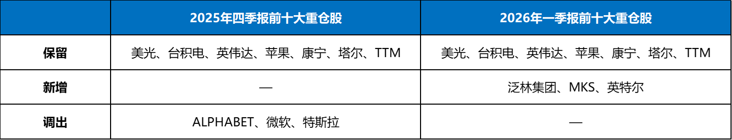 对比2025年四季报和2026年一季报,国富全球科技互联的前十大重仓股变如下: