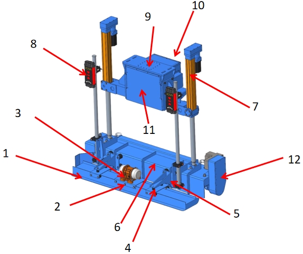 ▲第三代悬挂式整平机器人装配图(图中:1铝合金熨平板2振动电机座板3振动电机4振动板吊板5振动板吊架6刮板7左右调平伺服电缸8激光接收器9吊板10控制面板11控制单元12搅龙)