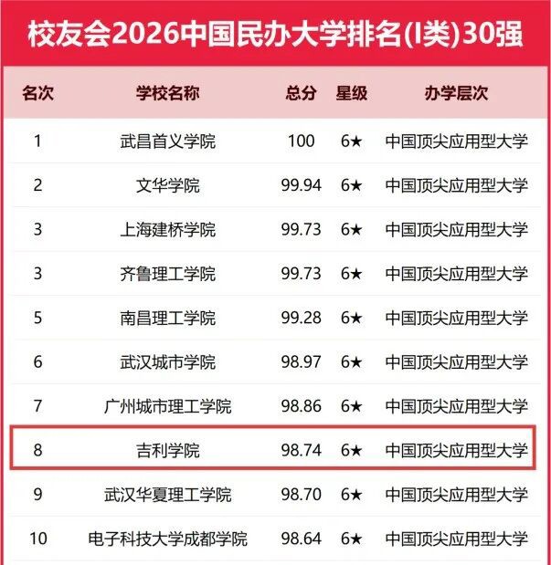 榜单显示,吉利学院位列中国民办大学排名第8名、中国理工类民办大学第8名,获评中国六星级应用型大学(6★),跻身中国顶尖应用型大学行列,办学层次与社会认可度持续提升。在四川省应用型高校序列中,学校位列四川省大学一流专业排名(应用型)第三位,稳居全省应用型高校第一方阵,彰显强劲综合实力与行业影响力。
