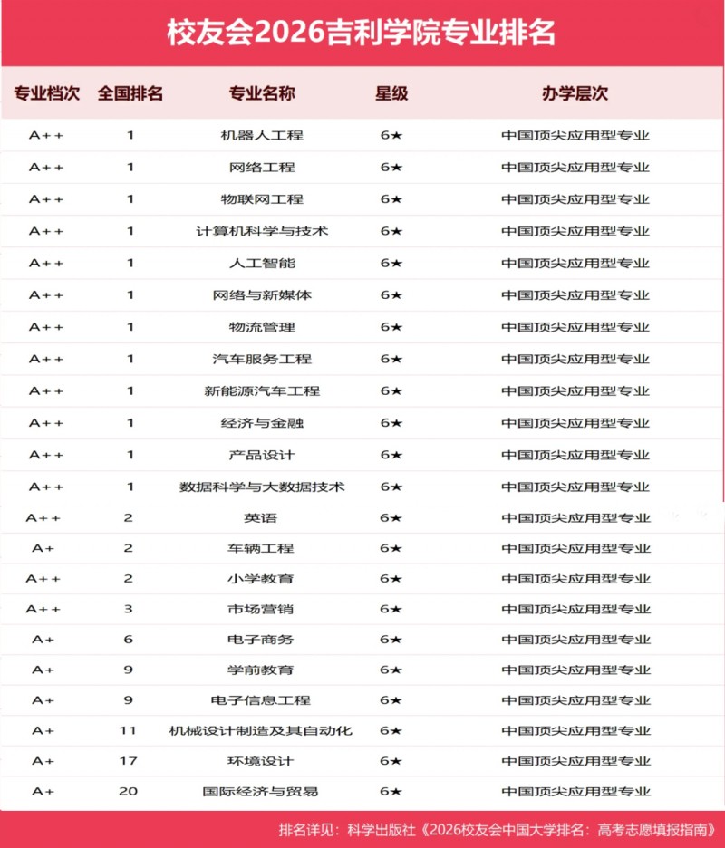 本次排名依据高校星级专业数量,按七星级、六星级、五星级、四星级等专业梯队科学排序,全面体现高校本科专业建设水平与人才培养质量。吉利学院专业建设成果亮眼:三个专业位居全国同类专业榜首,领跑全国;车辆工程、新能源汽车工程、计算机科学与技术、物联网工程、机器人工程、经济与金融、电子信息工程、国际经济与贸易等22个专业获评中国六星级应用型专业(6★),入选中国顶尖应用型专业行列;飞行器控制与信息工程、智能车辆工程、运动康复、金融科技、艺术设计学、大数据管理与应用、数字媒体艺术、财务管理等14个专业获评中国五星级应用型专业(5★),晋升中国一流应用型专业行列;表演、审计学等2个专业获评中国四星级应用型专业(4★),位列中国高水平应用型专业行列。