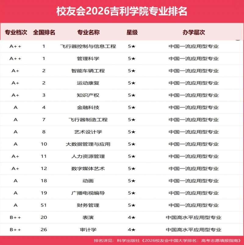 近日,全国第三方大学评价机构艾瑞深校友会网正式发布校友会2026中国大学一流专业排名与四川省大学一流专业排名,吉利学院凭借突出的专业建设成效、应用型人才培养实力与产教融合特色,斩获多项全国第一,综合实力稳居民办高校第一方阵、四川省应用型高校前三。
