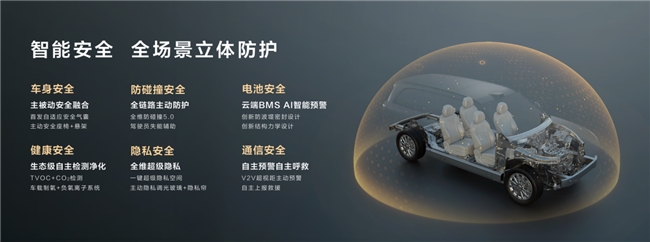 平台率先提出以场景定义的智能安全体系,实现了全场景立体防护。在车身安全方面,从硬扛到防护,安全气囊与座椅联动自适应,实现最优防护;在防碰撞安全方面,多传感器融合感知,全向预警与主动干预,实现失能即刻接管;在通信安全层面,卫星通信+V2V超视距预警,全域覆盖,自主报警,无论身在何处,安全始终在线。