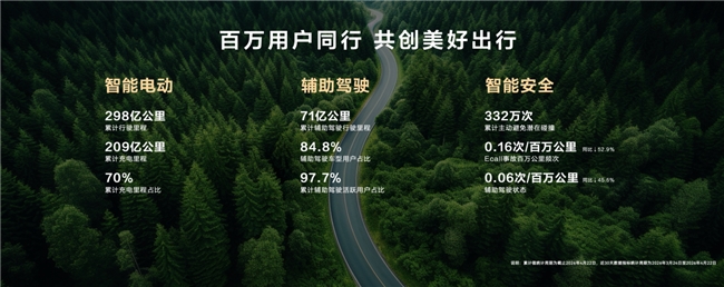 截至目前,问界用户的智能增程电动行驶总里程超298亿公里,累计充电里程达209亿公里、充电里程占比达70%,辅助驾驶总里程已超71亿公里,累计辅助驾驶活跃用户占比97.7%,累计主动避免潜在碰撞332万次,用智能安全牢牢守护每一位车主。