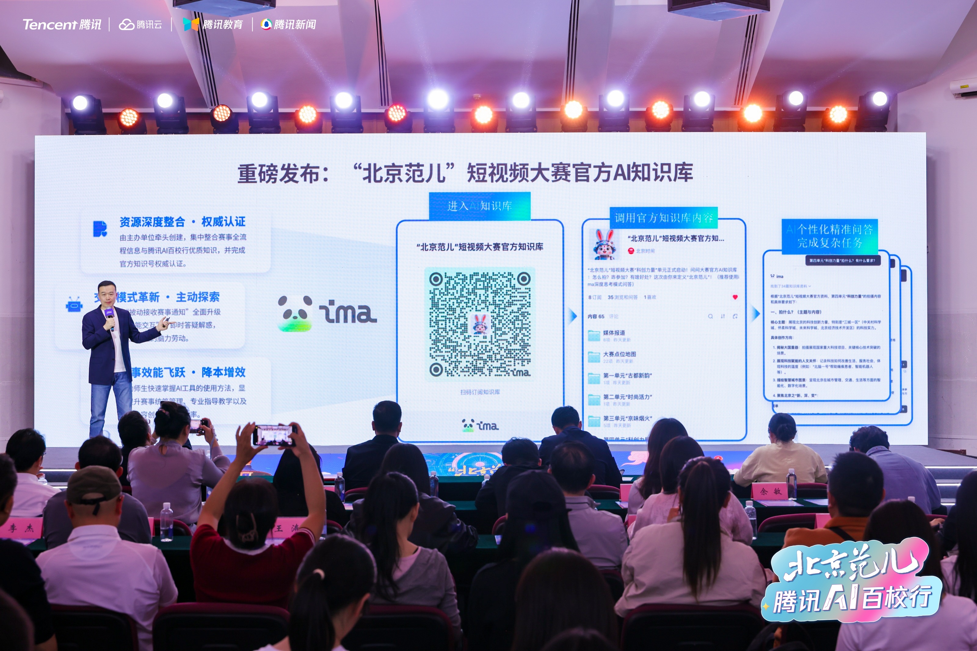本次活动是北京范儿大赛“科创力量”新单元的重要活动之一,为助力大赛进一步提升影响力,腾讯云利用ima知识库产品为本次大赛打造了专属AI知识库,整合了赛事全流程信息、参赛要求、官方拍摄地图等资源,让学生从“被动接收通知”升级为“主动发起 AI 交互",随时获得个性化参赛指导。同时,ima知识库作为高校师生的“第二大脑”,在教学场景广泛应用,北师大新传学院多位教授建设的ima知识库矩阵,沉淀了 2500+篇学术成果、学生 AI调用超14000次,教授的研究成果不仅服务课堂教学,更直接进入课外大赛的短视频策划创作,让学术研究走到实践一线,在“管、研、教、学"全链路实现提效。