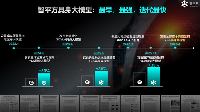 早在2024年6月,智平方就推出了AlphaBrain的初期版本,这也是全球创业公司中首个VLA大模型,在模型规模仅为谷歌同类模型1/20的情况下,性能提升超过80%。2025年6月,智平方推出了快慢系统深度融合的新一代VLA架构,成为业内首个“异构输入+异步频率”的双系统VLA模型,性能直接超越国际标杆Pi0达30%。