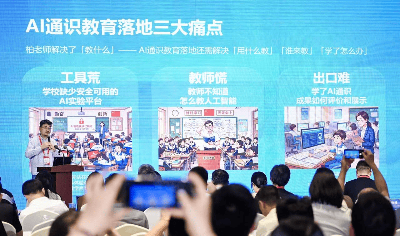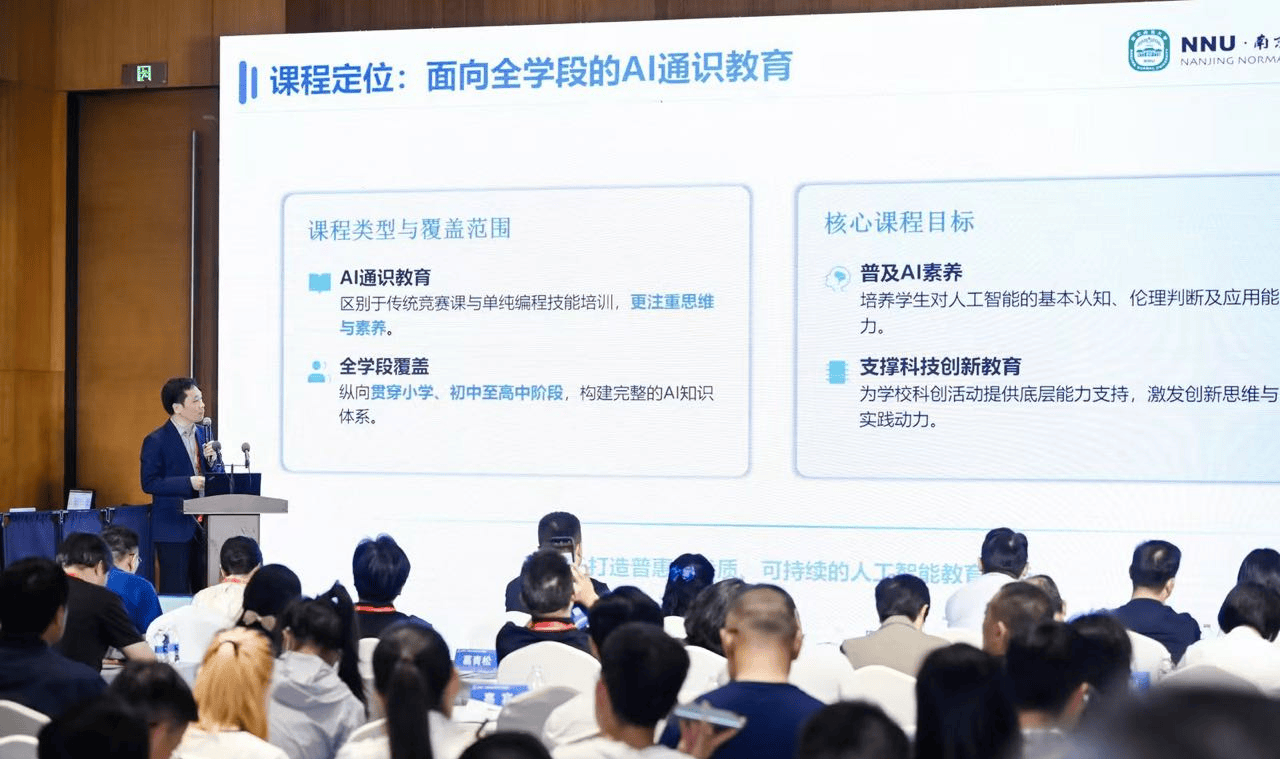 接着,中科院计算所物端计算实验室主任张磊研究员作了题为《人工智能与计算思维》的主题报告。南京师范大学教育科学学院副院长柏宏权教授在会上正式发布了覆盖小学一年级至高中二年级共11学段的一体化人工智能通识课程体系,首次实现课标要求到课堂教学的全学段贯通衔接。