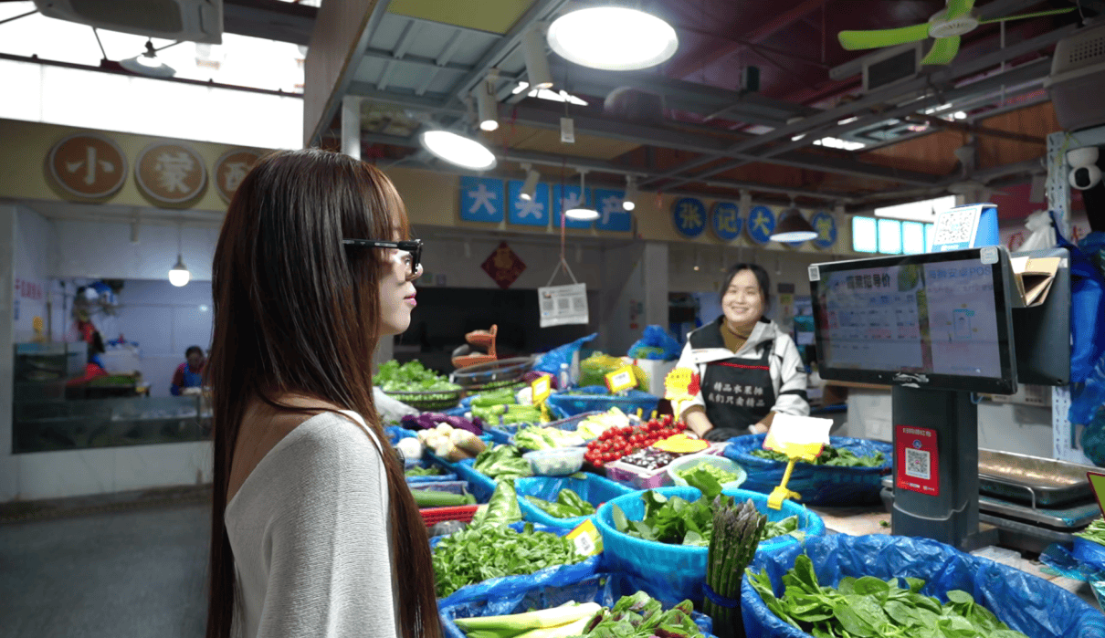 在SUN的带领下,达人们穿梭摊位,沉浸式体验上海市民的日常采购氛围。传统市集的热闹之外,便捷的智慧生活细节随处可见。陈美媛(Luxsua)现场体验近距离碰一碰快捷支付,帕缇(Patty)借助智能设备购入奶茶,随后SUN带领大家体验智能眼镜付款、物品识别等功能,近距离感受智能科技融入日常的全新方式。