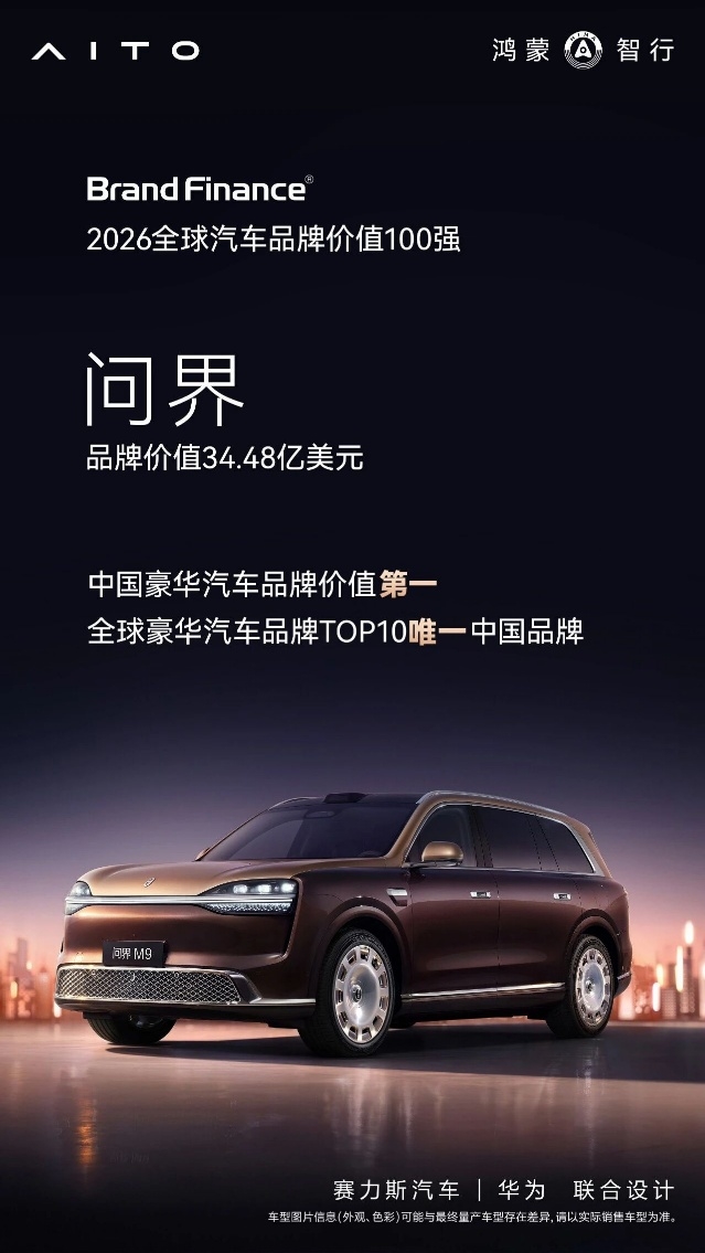 据了解,在Brand Finance发布《2026全球汽车品牌价值100强》榜单中,问界首次上榜,以34.4788亿美元的品牌价值、问界品牌强度指数(BSI)77.8,位居中国豪华汽车品牌价值第一,成全球豪华汽车品牌TOP10中唯一中国品牌。毫无疑问,中国高端新能源品牌在全球范围内的价值跃升,迎来里程碑时刻。
