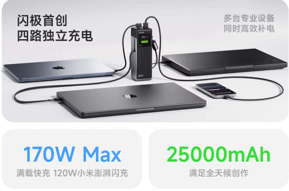 闪极170W超充站移动电源的核心创新在于行业首创的四路独立充电架构。通过四核安全芯片的智能调度,支持最高170W总功率输出,四个接口可同时为手机、笔记本、相机、无人机等设备充电,且互不干扰。这一设计直击用户痛点:传统移动电源多接口共享功率,导致多设备同时充电时速度骤降,而闪极的智能功率分配技术确保每台设备均能获得稳定高效的充电速度,真正实现“不减速”体验。