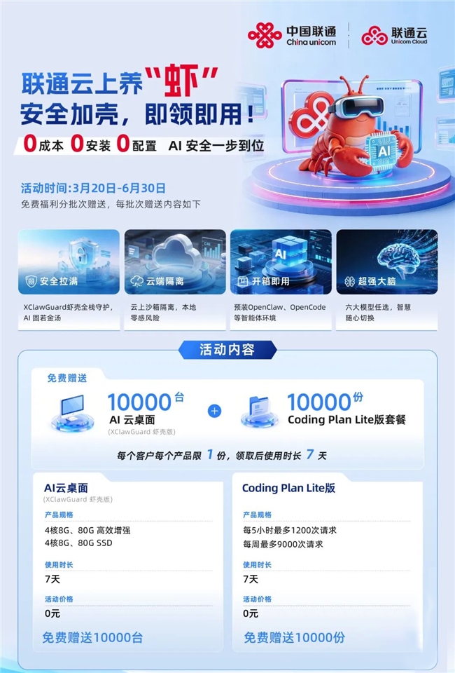 目前,联通云重磅推出Coding Plan+联通AI云桌面(虾壳版)专属活动,本次活动将免费赠送万份Coding Plan套餐,让OpenClaw等AI智能体不仅“能用”,更“好用、易用、敢用”。无论是软件开发、日常办公、教学演示还是创意创作,来联通云,体验即领即用的便捷,让AI生产力触手可及!