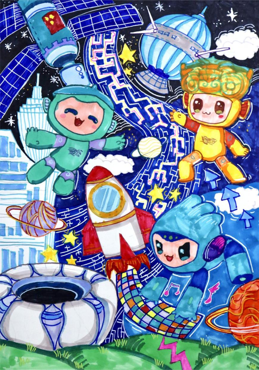 北斗卫星遨游太空,“莲花碗”里暗藏“黑科技”,有着小机器人模样的“莲莲”“琮琮”“宸宸”展现着不同的姿态……我的作品是不是有着满满的“科技味”呢?
