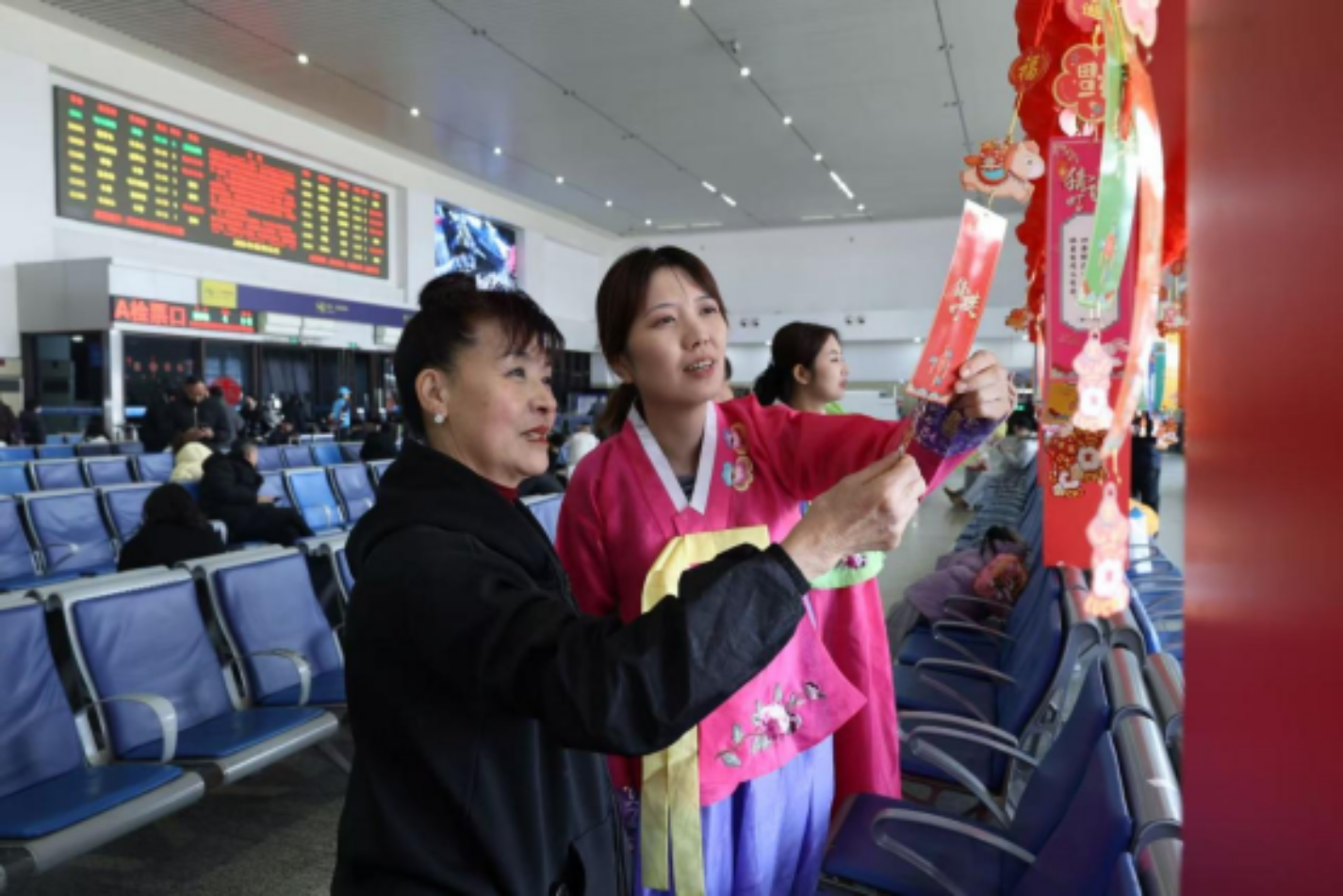 (身着民族特色服饰的志愿者,带着候车旅客在敦化站车站大厅猜灯谜)