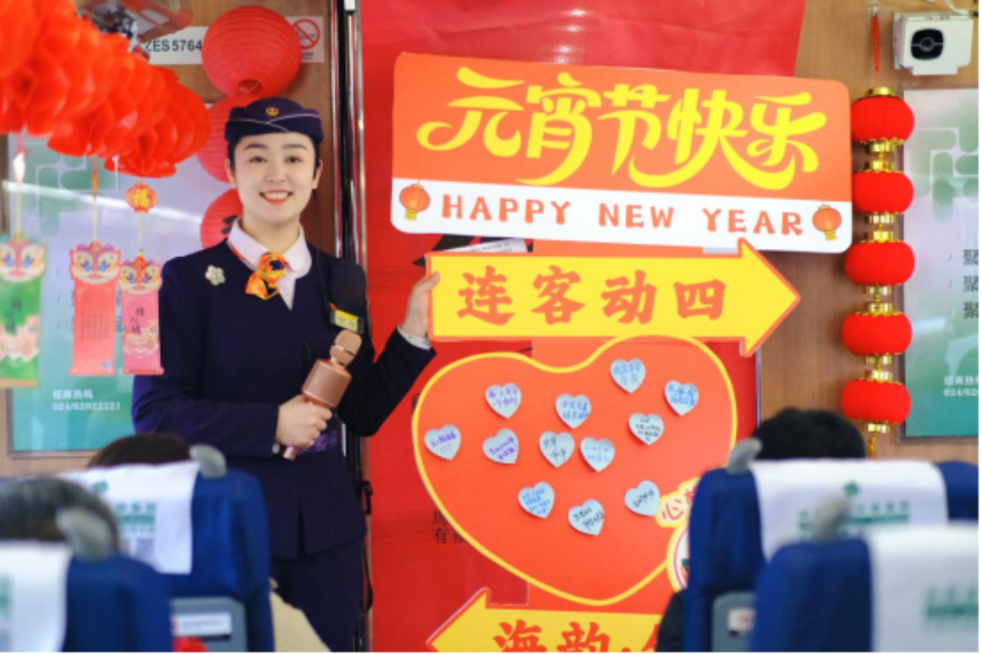 (G3624次列车乘务员身着传统服饰为旅客发放小礼品)